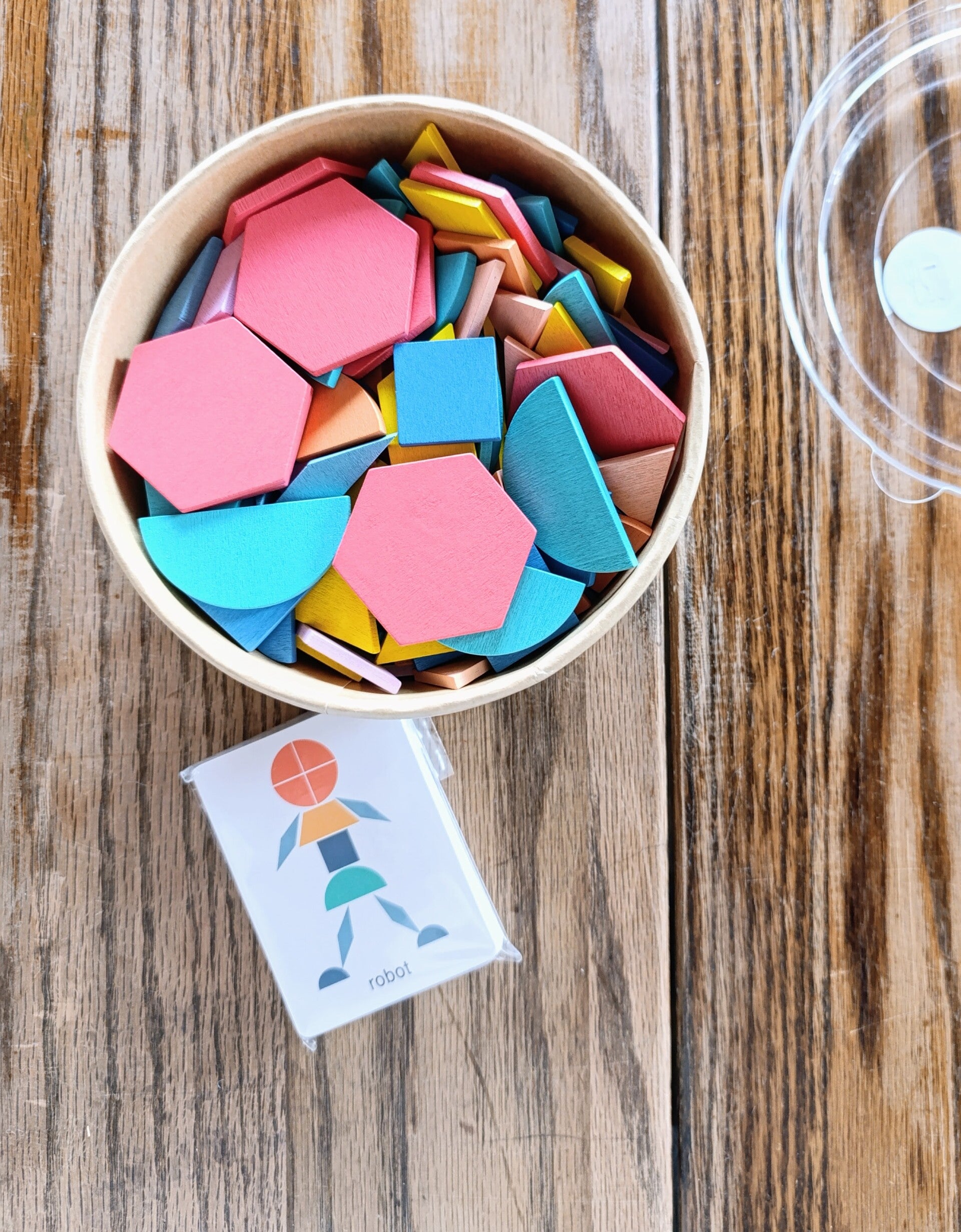 Houten puzzelstukken, 180 stukjes, in diverse kleuren!Met een hele stapel kaarten (recto verso) met voorbeelden om na te maken. Aan te raden = vanaf vier jaar vanwege de kleine onderdelen en de moeilijkheidsgraad.